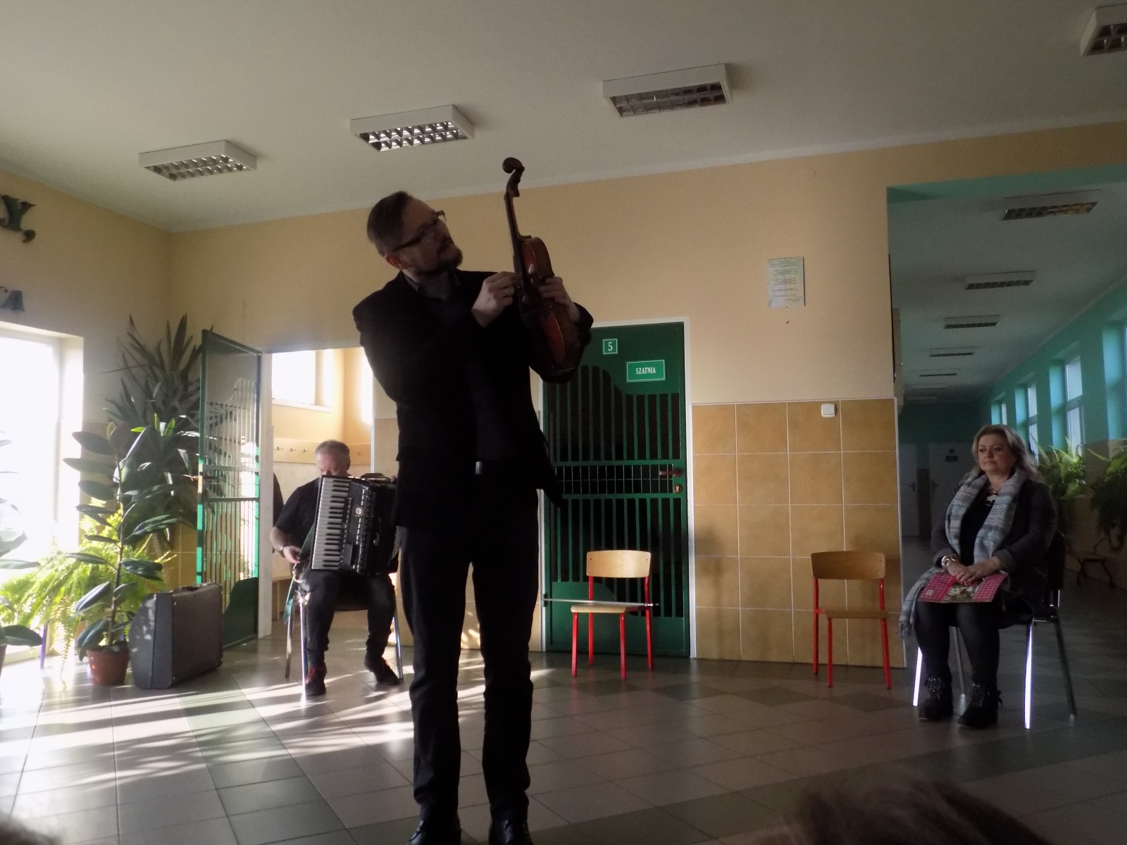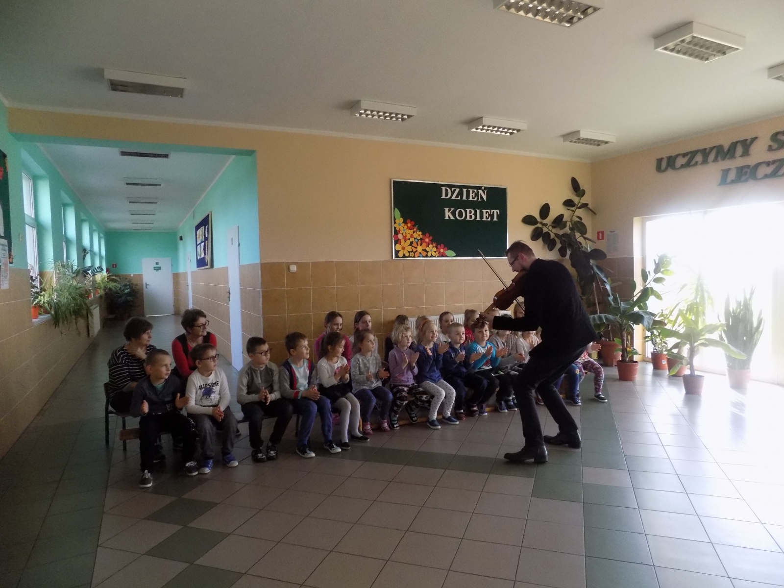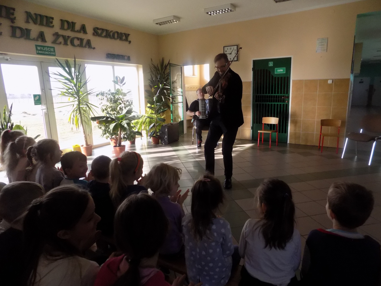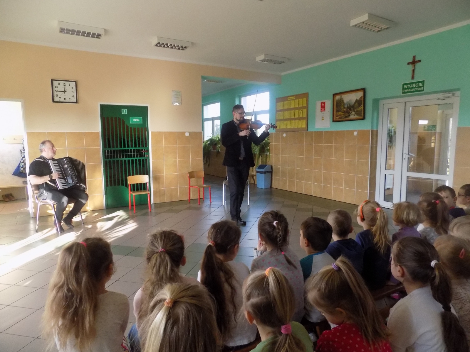 To już siódmy raz uczniowie naszej szkoły mogli spotkać się z muzykami spółki ART-ES oraz zaproszonym przez nich gościem Robertem Rydygiertem. Tym razem bohaterami spotkania były skrzypce oraz akordeon. Pan Robert Rydygiert w bardzo ciekawy sposób opowiedział dzieciom o budowie skrzypiec oraz o sposobie gry na tym instrumencie. W kilku słowach przedstawił także sylwetki wybitnych polskich skrzypków. Henryka Wreniawskiego i Karola Lipińskiego.