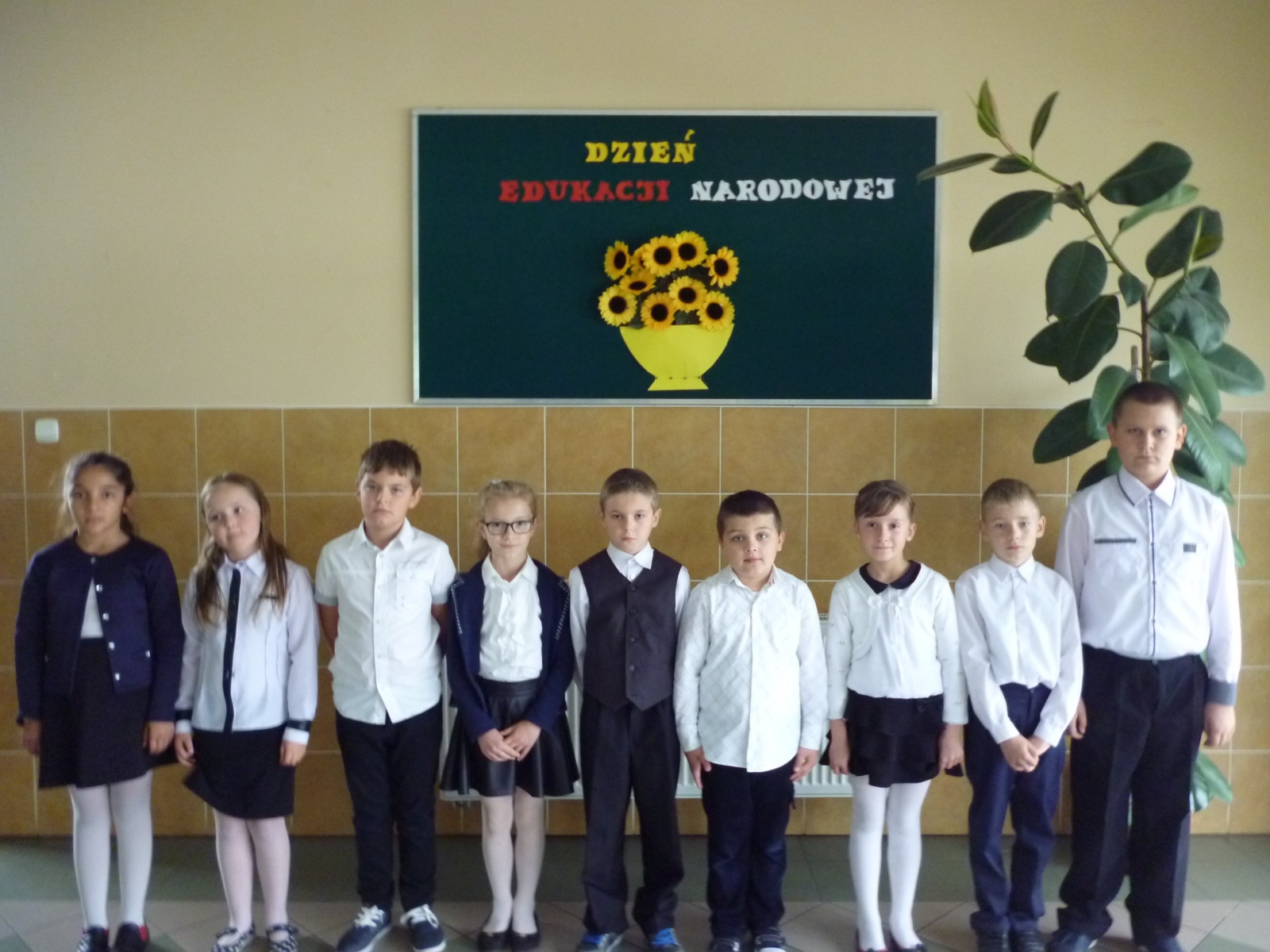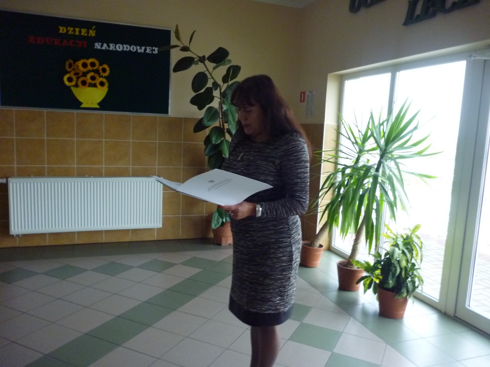 Wśród wielu szkolnych uroczystości jest taki dzień, w którym uczniowie w szczególny sposób wyrażają wdzięczność swoim nauczycielom za ich trud. Uczniowie klasy II i III przygotowali z tej okazji krótki program artystyczny. Wszyscy z uwagą słuchali słów małych artystów a często humorystyczne scenki wywoływały uśmiech na twarzach pań nauczycielek. Po uczniach zabrała głos pani dyrektor Iwona Krajewska, która złożyła swoim pracownikom najszczersze życzenia. Pani dyrektor wręczyła także nagrody pani Marii Maciejewskiej i Gabrieli Idziak za wzorowe wypełnianie swoich obowiązków. Rada Rodziców natomiast ufundowała dla wszystkich pracowników pysznego torta.
