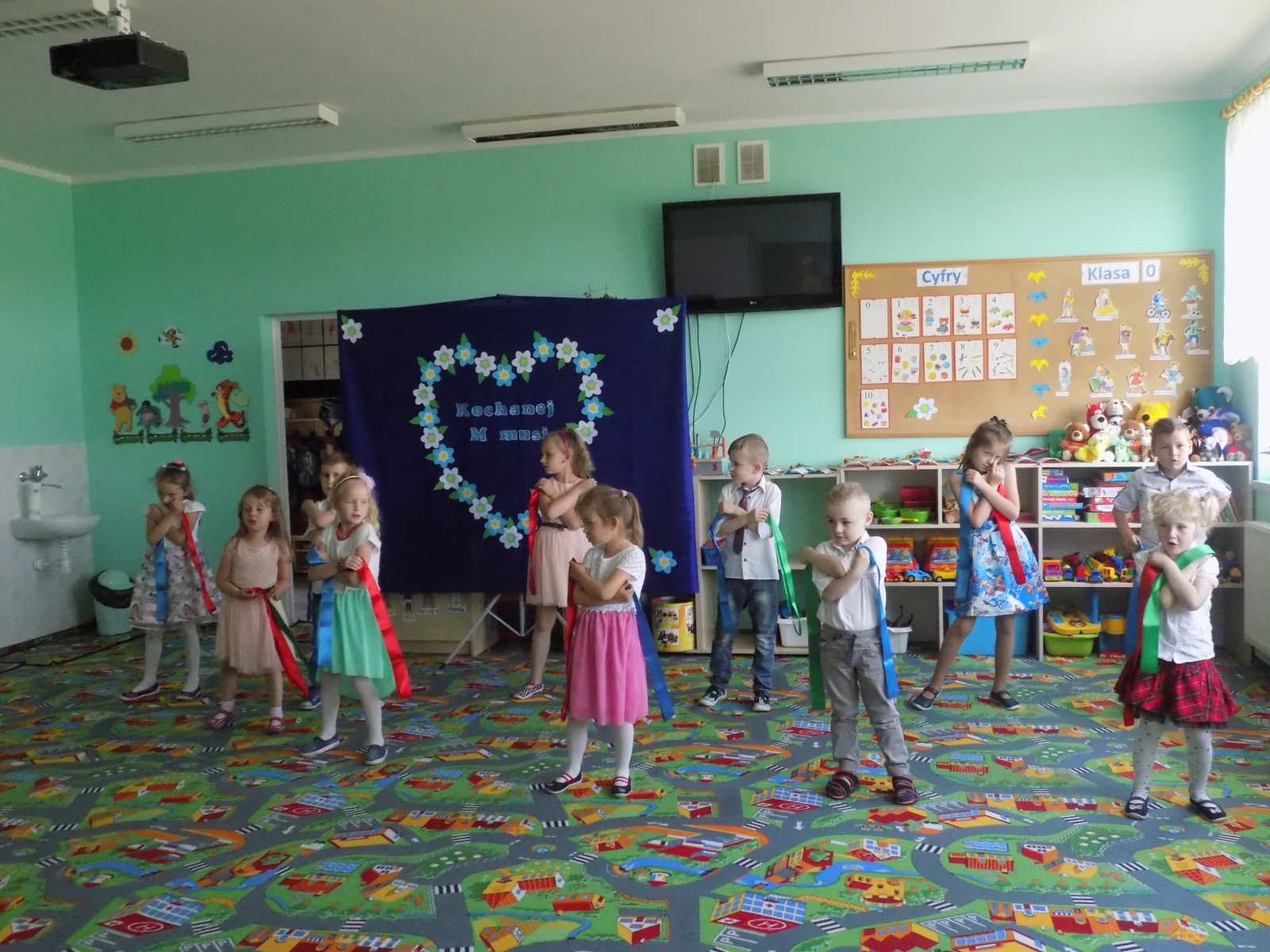 Na wstępie pani dyrektor Iwona Krajewska powitała przybyłe Mamy życząc im dużo radości, uśmiechu i pociechy ze swoich dzieci. Przedszkolaki poprzez wiersze, piosenki, taniec i życzenia przekazały jak bardzo kochają swoje mamy.