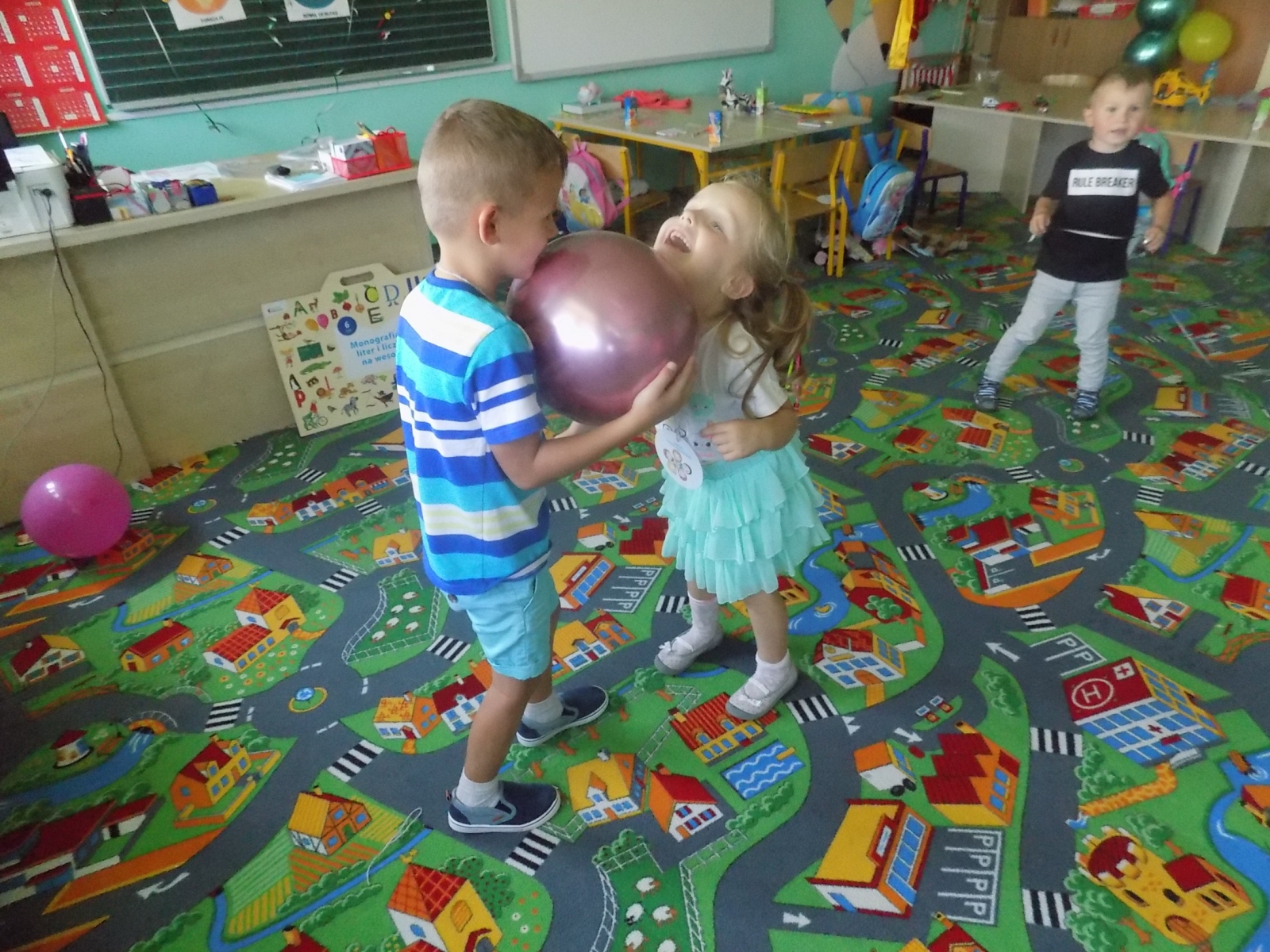 Po zabawie swoimi ulubionymi zabawkami dzieci zostały zaproszone do wspólnej zabawy tanecznej i udziału w konkursach. Przedszkolaki zaliczyły m.in. bieg z jajkiem na łyżeczce, bieg z woreczkiem na głowie, taniec z balonami, które na końcu ozdobiły, zgodnie z własnymi pomysłami. Dużą atrakcją okazało się także malowanie kredą przed szkołą. Radość, śmiech i głośny doping uczestników świadczyły o wspaniałej zabawie. Po zabawie dzieci otrzymały medale i dyplomy przedszkolaka a także upominek ufundowany przez rodziców.