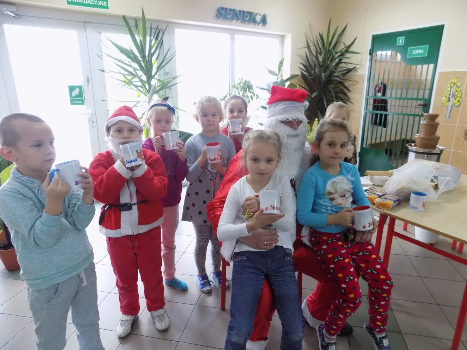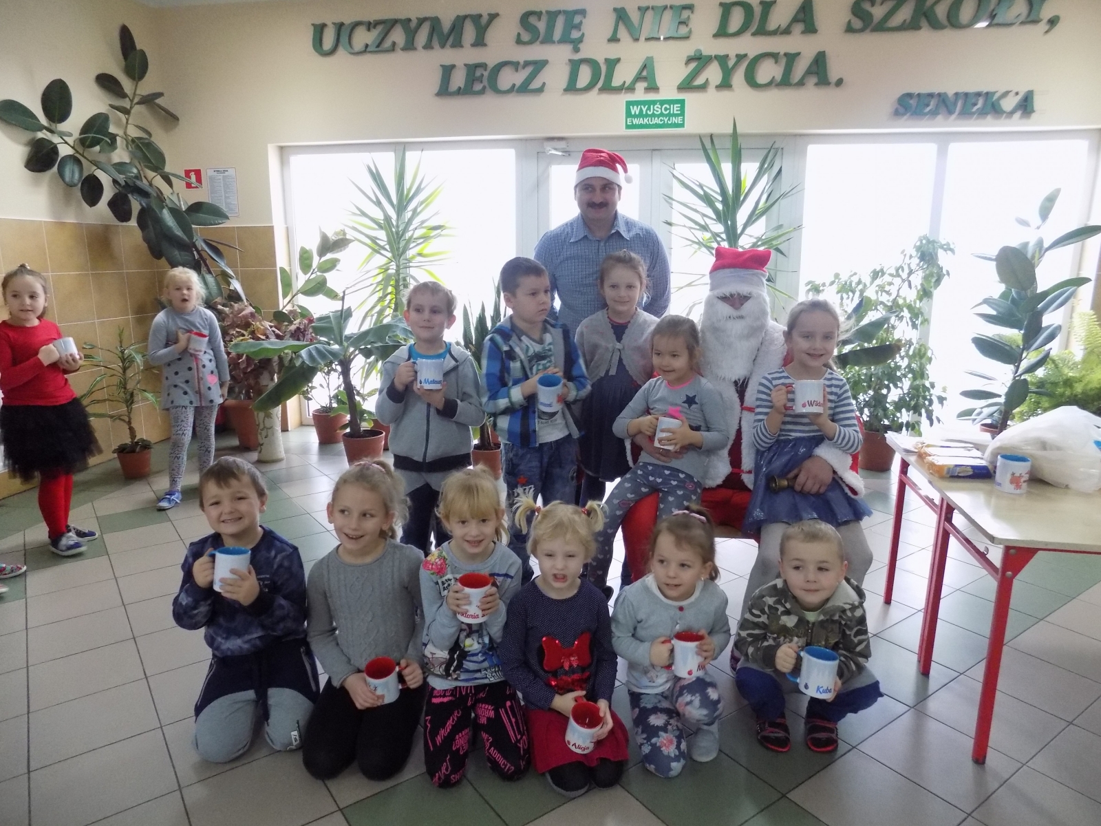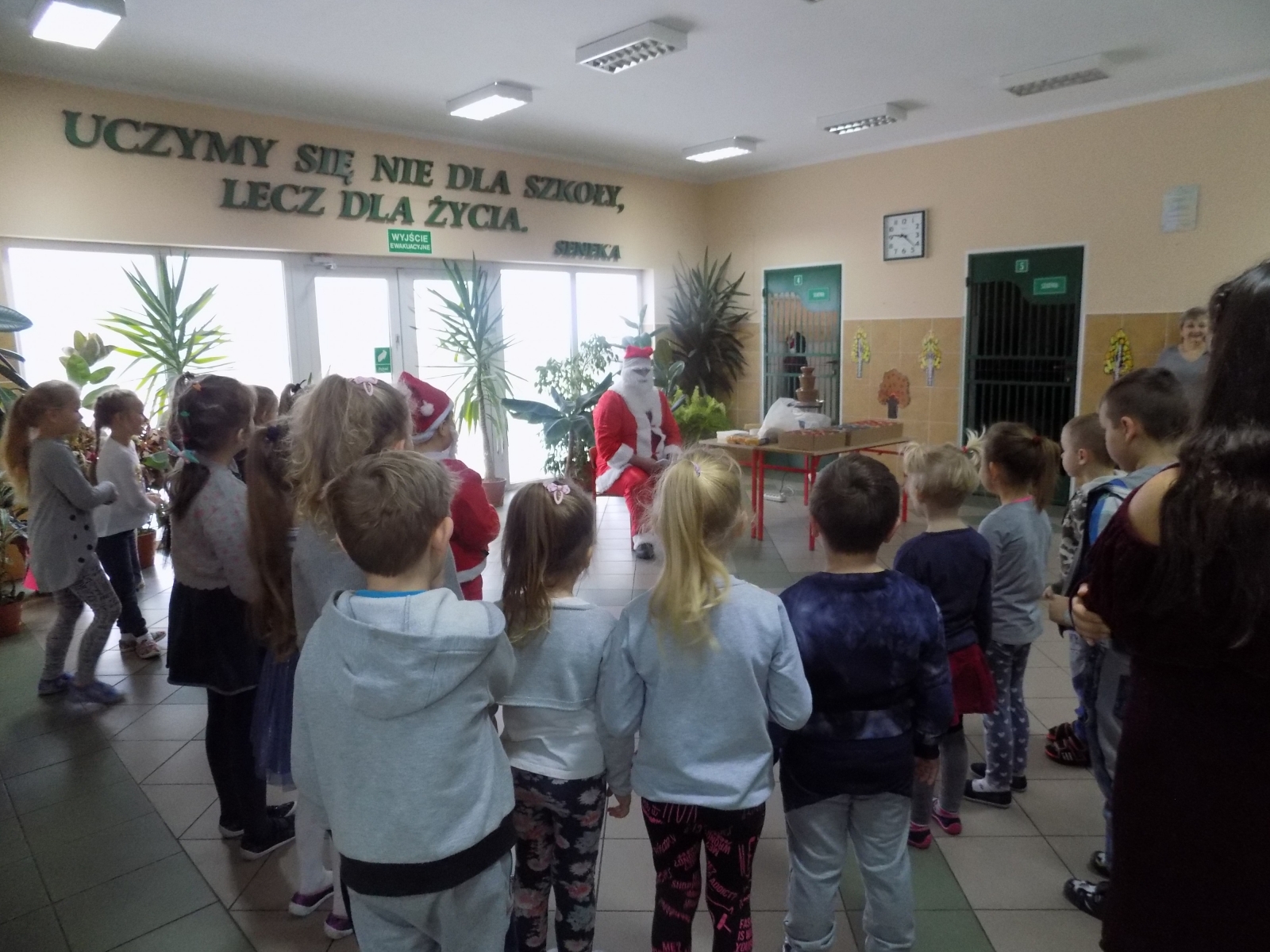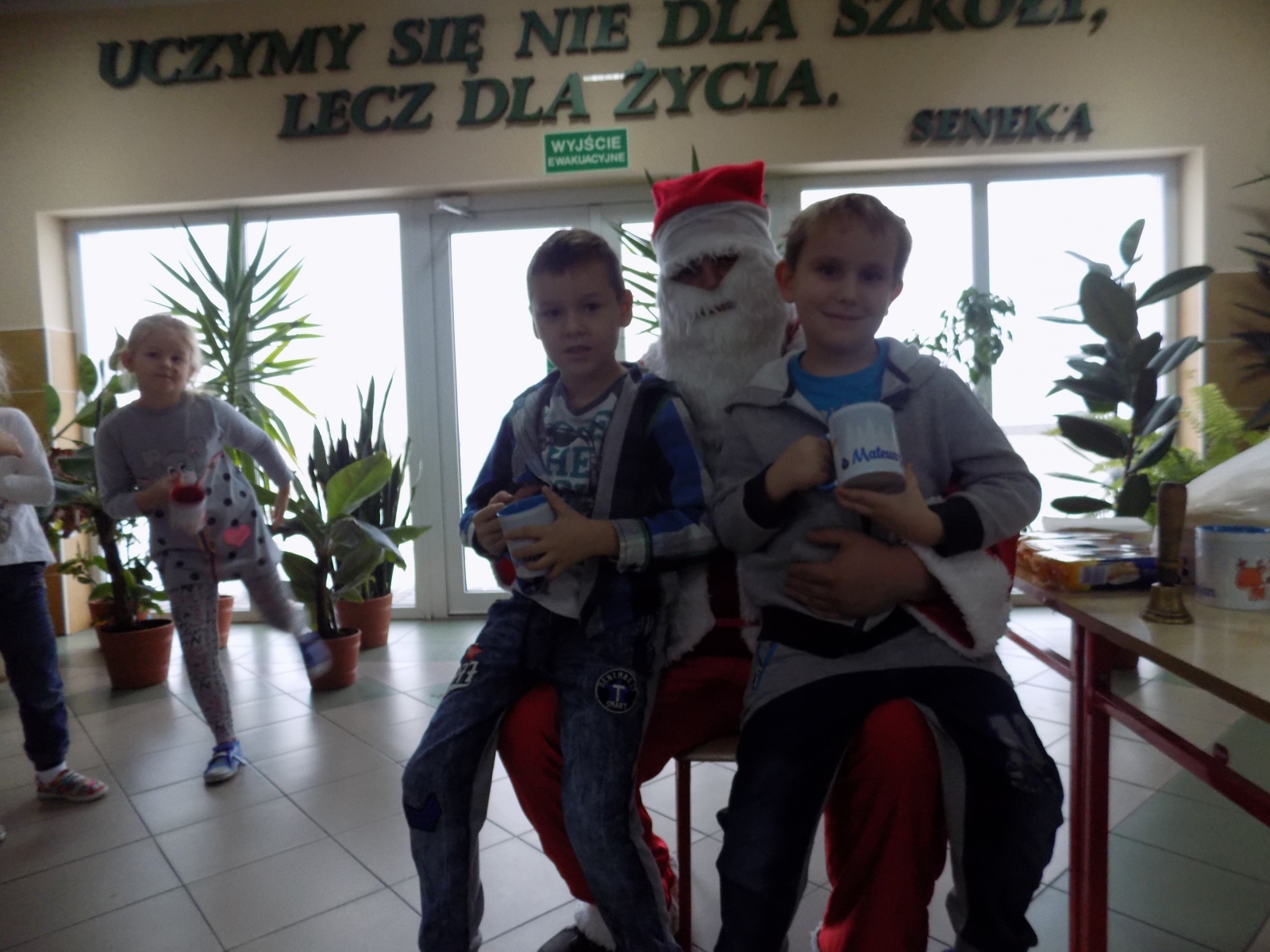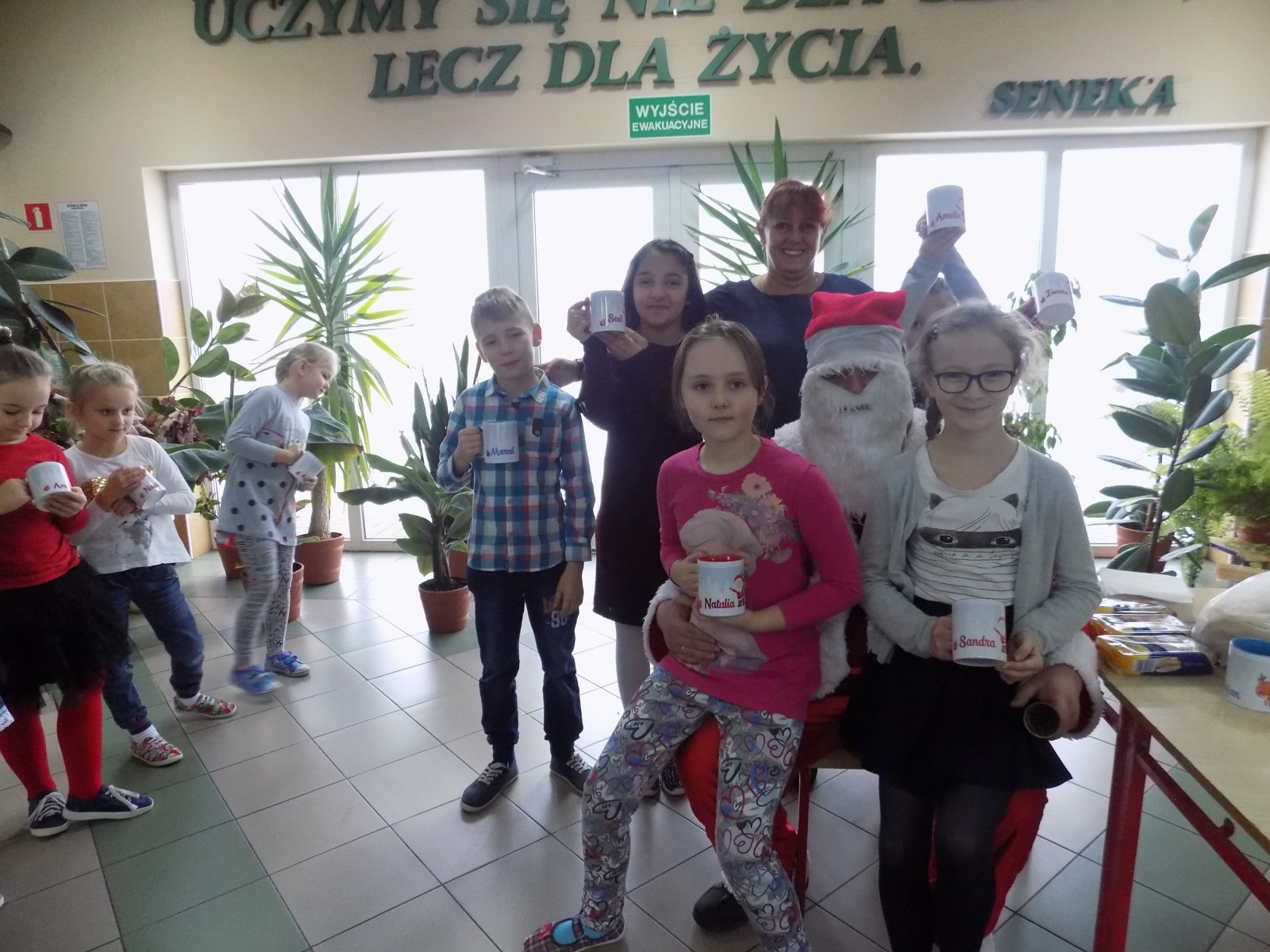 6 grudnia to jedna z wielu dat w kalendarzu szkolnym, na którą dzieci czekają z niecierpliwością. Od rana czuć było w szkole podniosły nastrój. Młodsze dzieci przygotowywały laurki a starsze pisały listy do Mikołaja. Około godziny 9.30 rozległ się na korytarzu znajomy dzwonek. Dzieci z radością powitały niezwykłego gościa. Na początku zaśpiewały dla niego piosenki a potem wręczyły laurki. Nadszedł długo oczekiwany moment - wręczenie upominków. W tym roku uczniowie a także pracownicy szkoły otrzymali świąteczne kubeczki z imieniem. Na koniec dzieci robiły sobie z Mikołajem pamiątkowe zdjęcia.