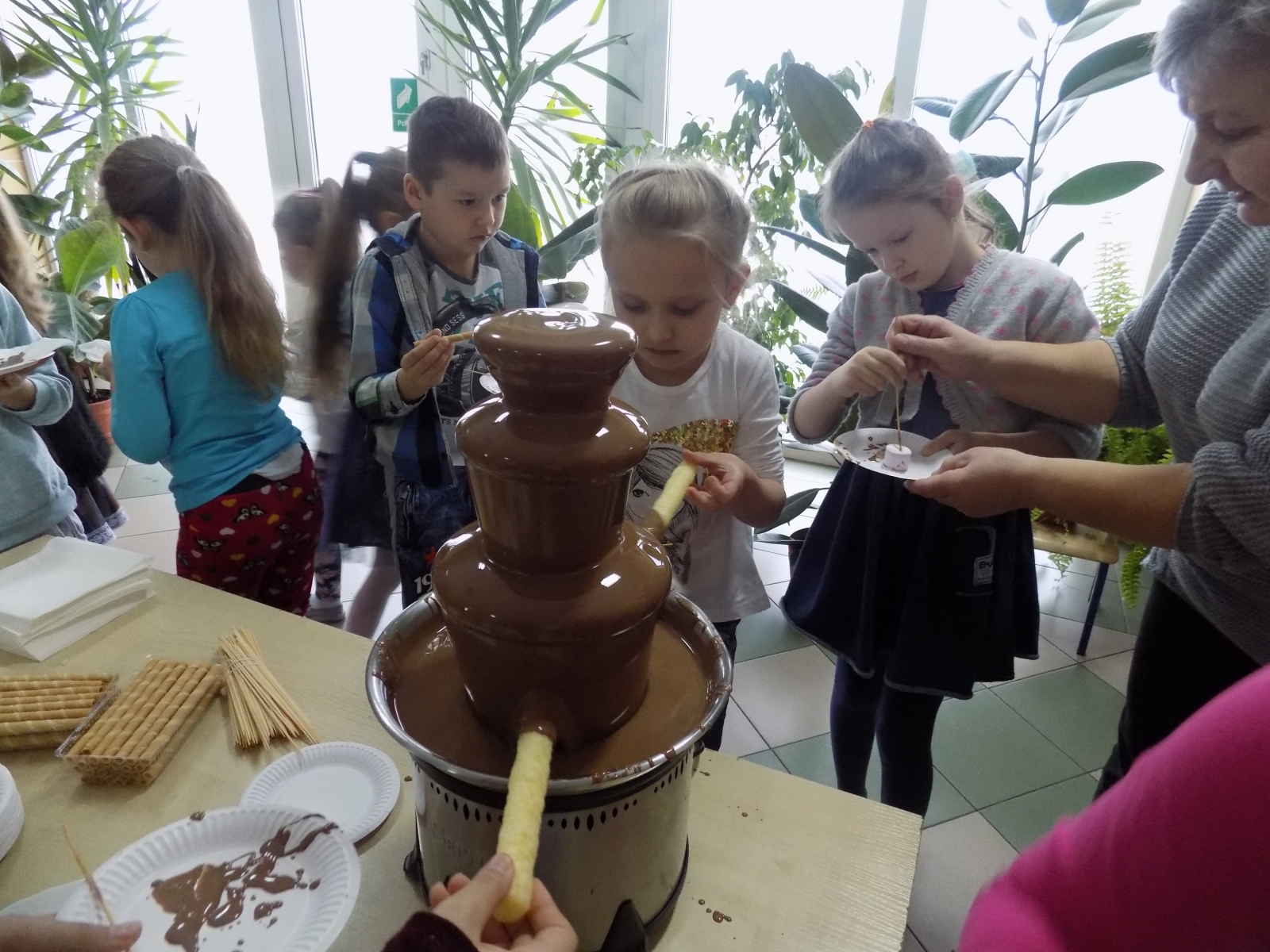 Jak się okazało to nie koniec niespodzianek na ten dzień, ponieważ pani sołtys - Ilona Izydorczyk ze środków funduszu sołeckiego oraz Rada Rodziców ufundowały dla dzieci fontannę czekolady.