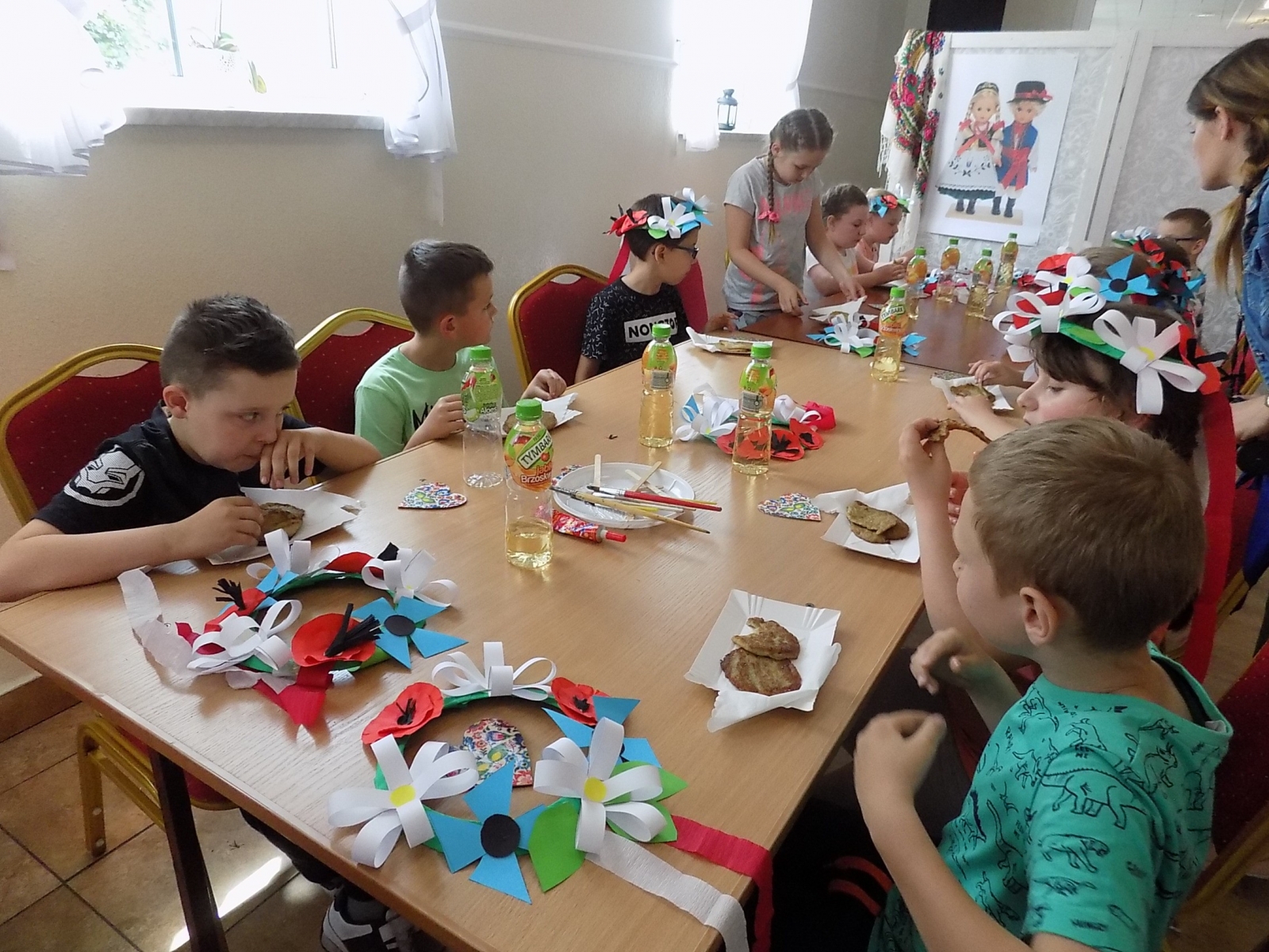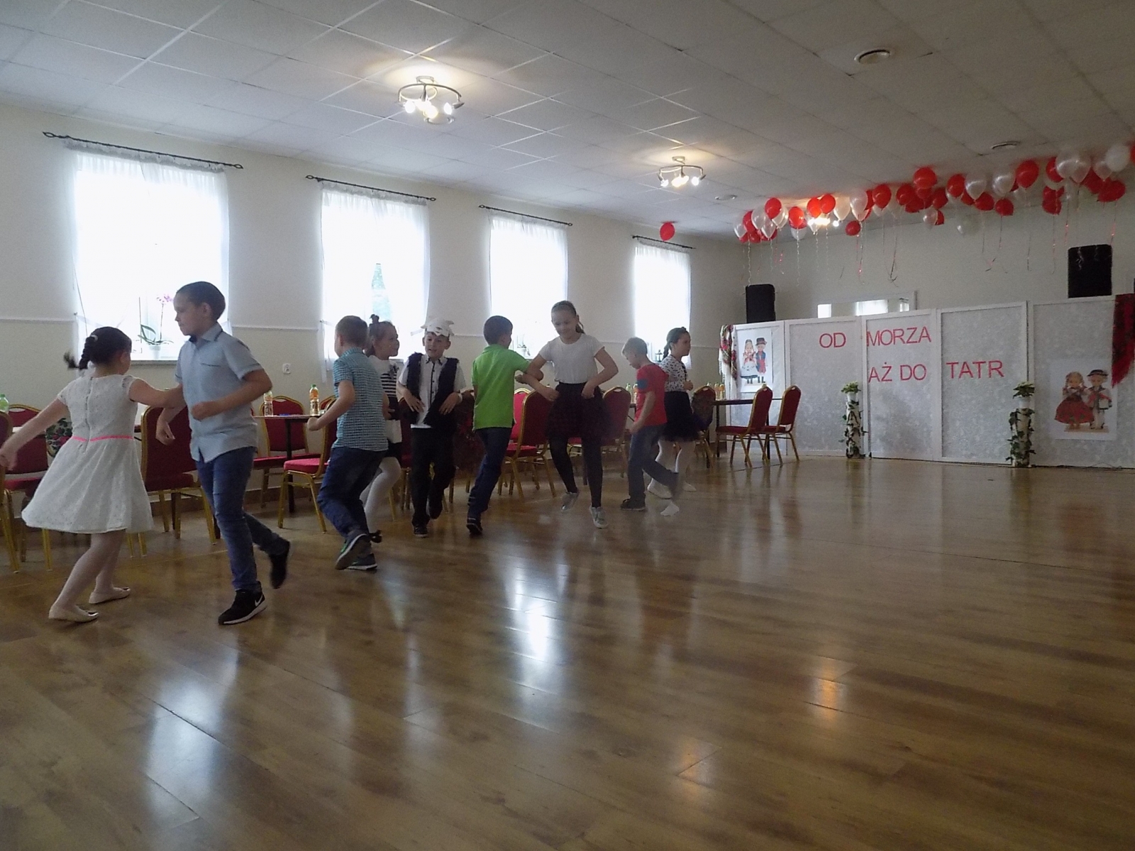 Program maratonu składał się z czterech części. W pierwszej części dzieci z naszej szkoły zaprezentowały się w krótkiej części artystycznej. Kolejnym punktem programu był pokaz i nauka zabaw regionalnych: „Gołumbek”, „Nasa koza becy”, „Ojciec Wirgiliusz” oraz „Chłop” w wykonaniu uczestników maratonu. Zabawy przeplatane były zajęciami warsztatowymi , podczas których dzieci uczyły się techniki decoupage, ozdabiając drewniane serduszko motywami łowickimi. Wykonały również wianek zdobiony polskimi kwiatami: makami, chabrami i rumiankami wyciętymi z papieru. Zabawę zakończył poczęstunek wielkopolską potrawą- plyndzami- przygotowanymi przez mamy naszych uczniów.