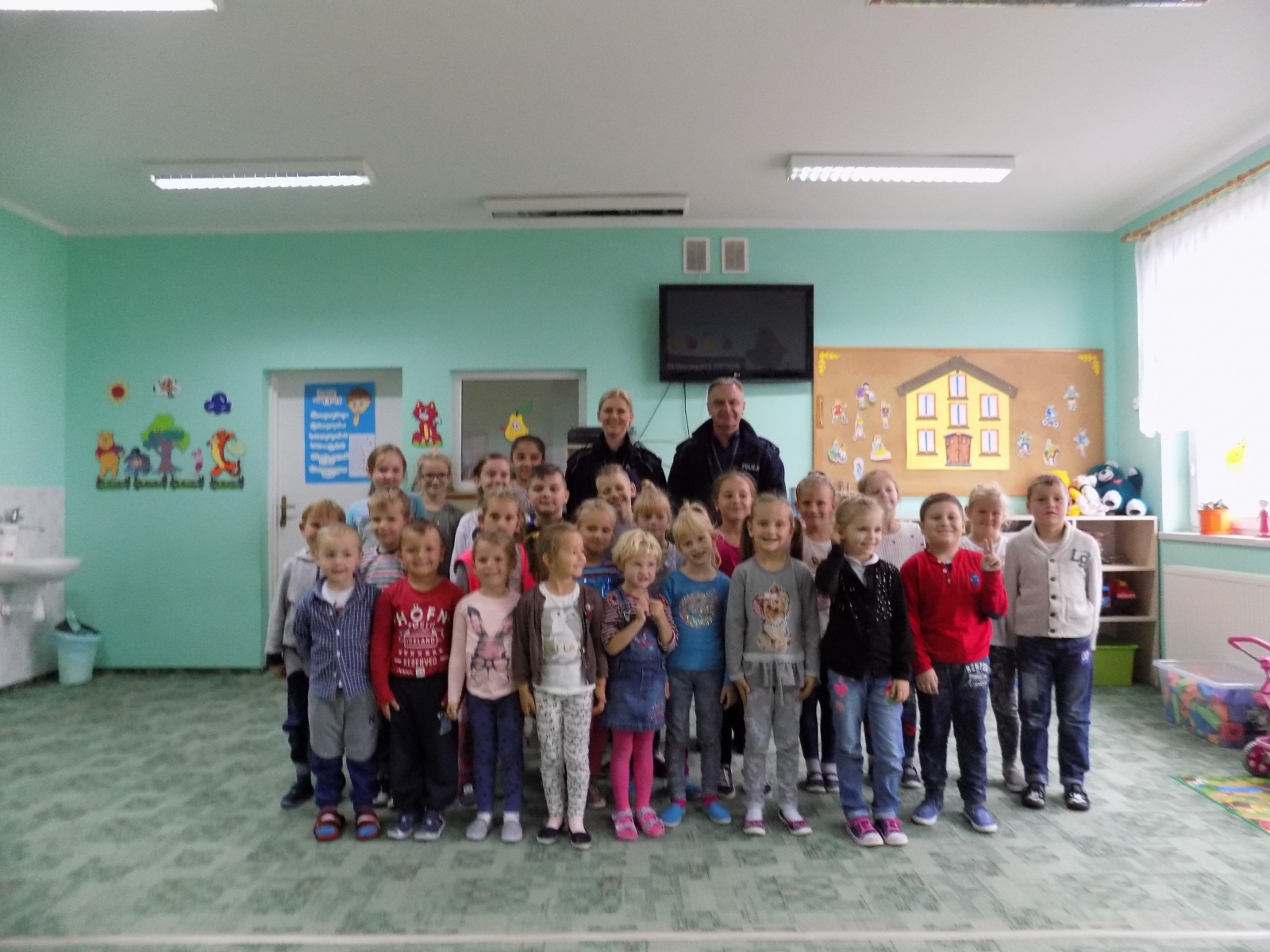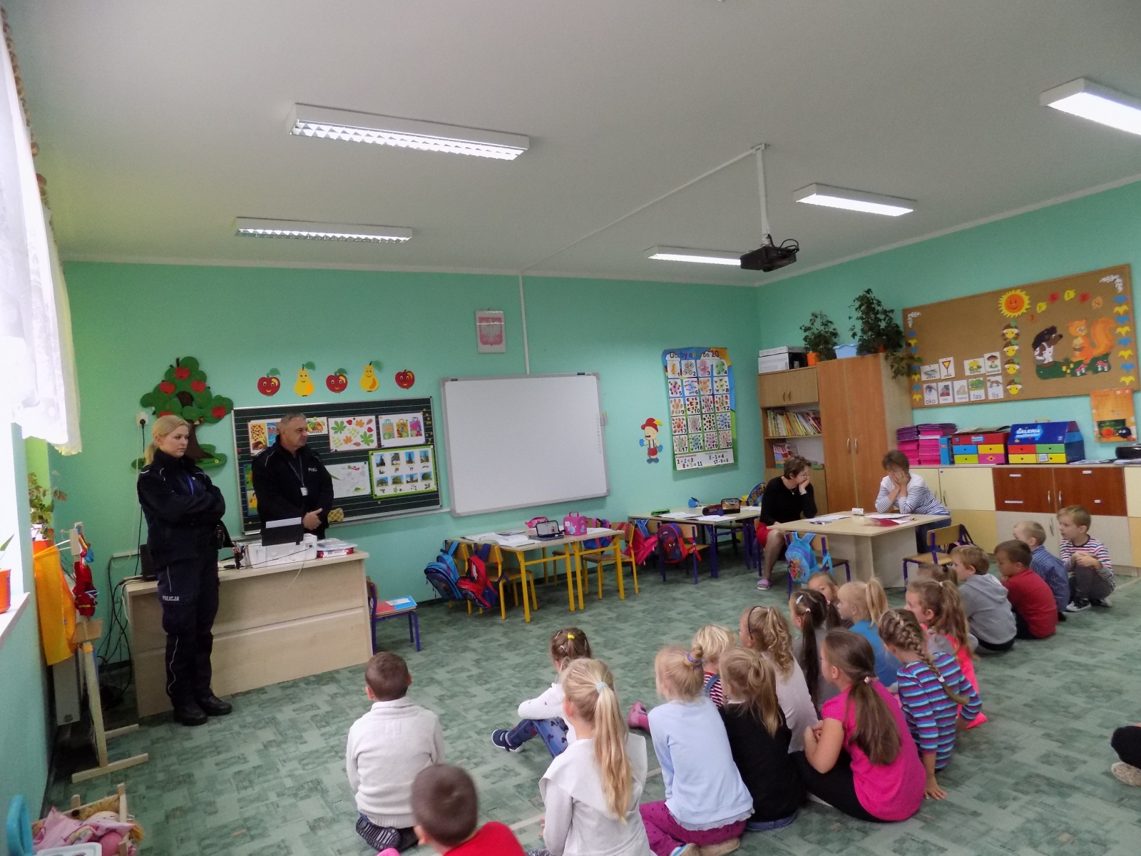 Odbyło się spotkanie z dziećmi poświęcone bezpieczeństwu na drodze oraz w domu. Funkcjonariusze zadawali pytania dotyczące właściwych zachowań, na które dzieci odpowiadały w oparciu o własne doświadczenia. Uczniowie mieli także okazję, aby więcej dowiedzieć się o pracy policjanta.
