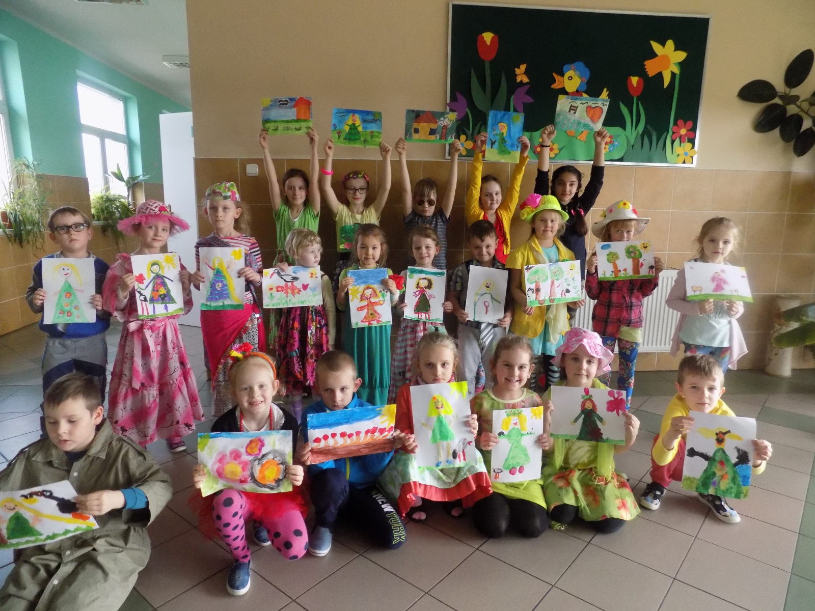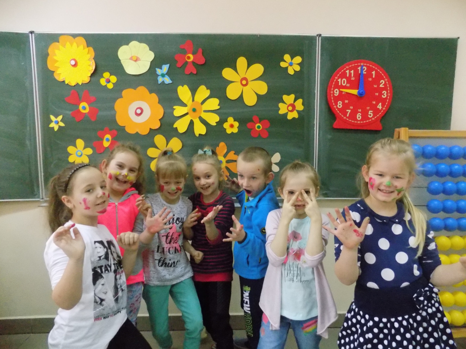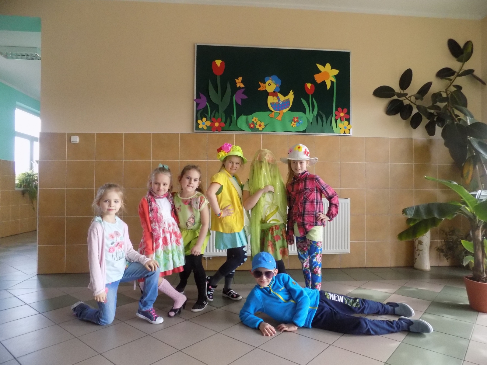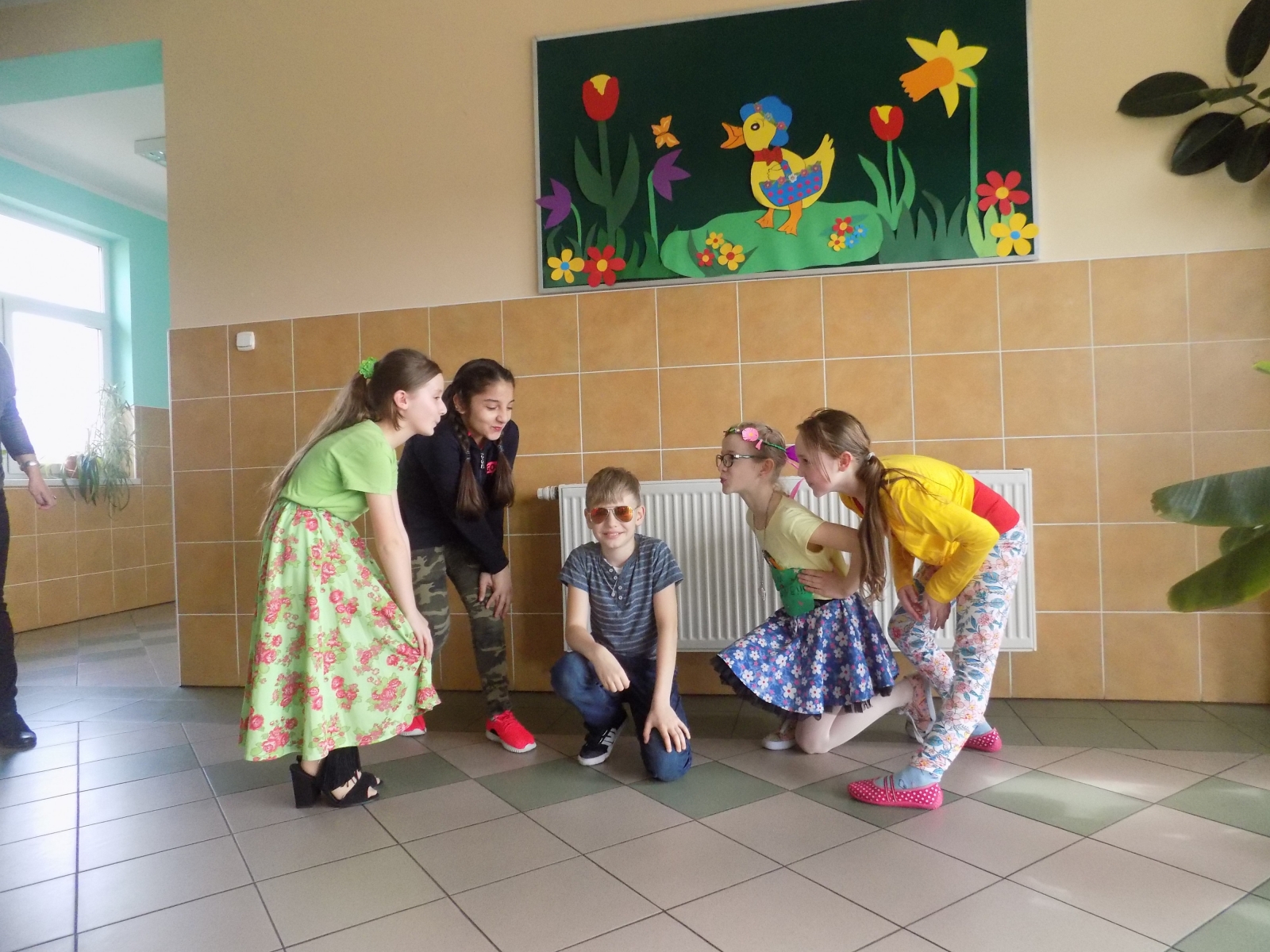 W naszej szkole uczniowie od rana malowali farbami wiosenne obrazy. Kolorowe farby trafiały nie tylko na kartki papieru. Na zakończenie zajęć odbył się pokaz mody wiosennej. Na wybiegu prezentowały się "sukienki babci", "krawaty taty", "kapelusze mamy", "wesołe kolory" i "doskonały humor". Pokaz zakończył się sesją zdjęciową. Uczniowie wracali do domów w doskonałych nastrojach i takiego właśnie samopoczucia życzymy wszystkim na kolejne wiosenne dni.
