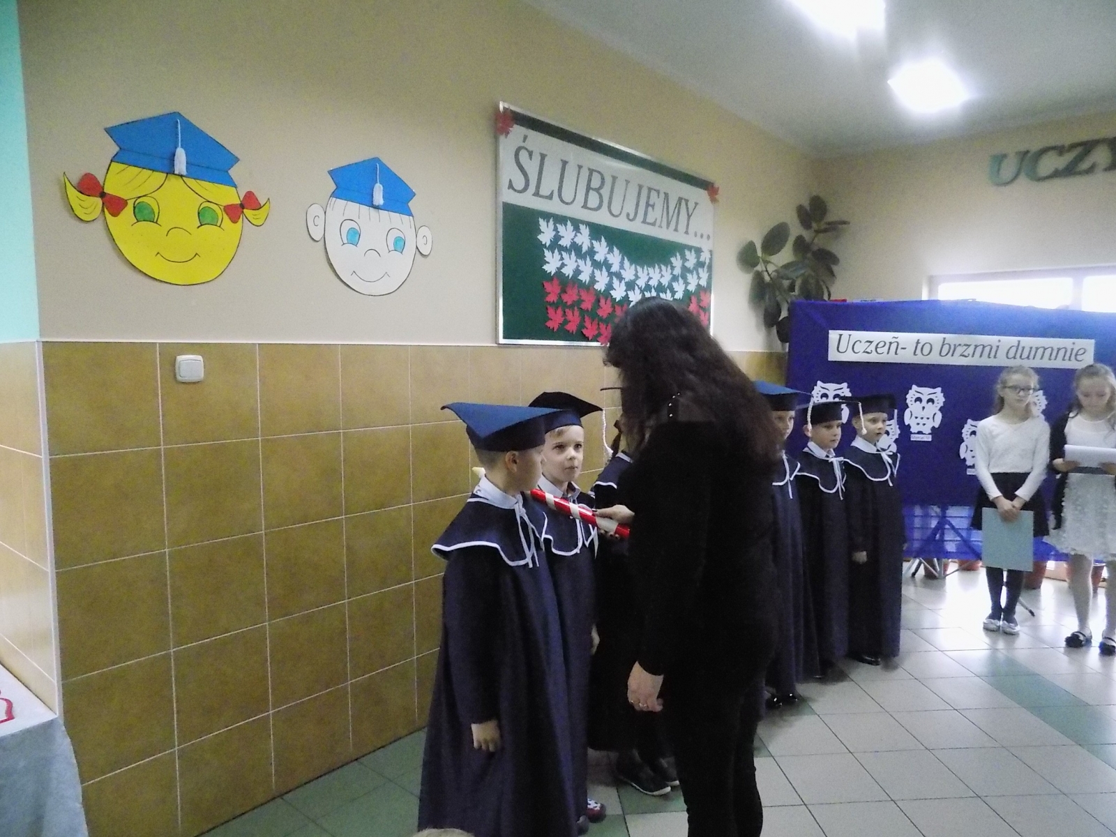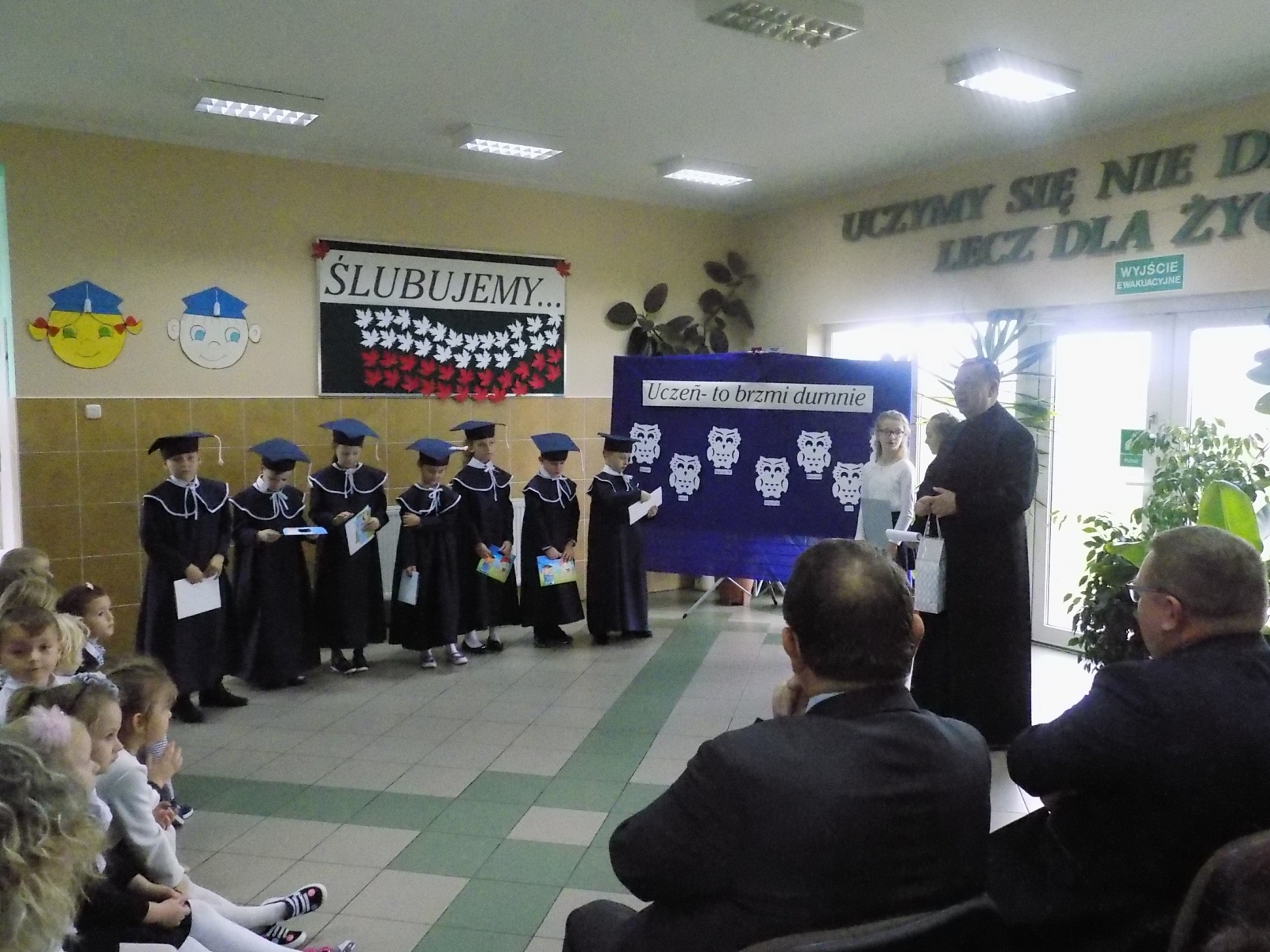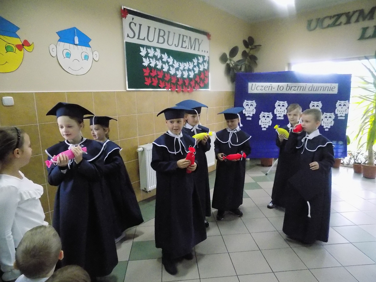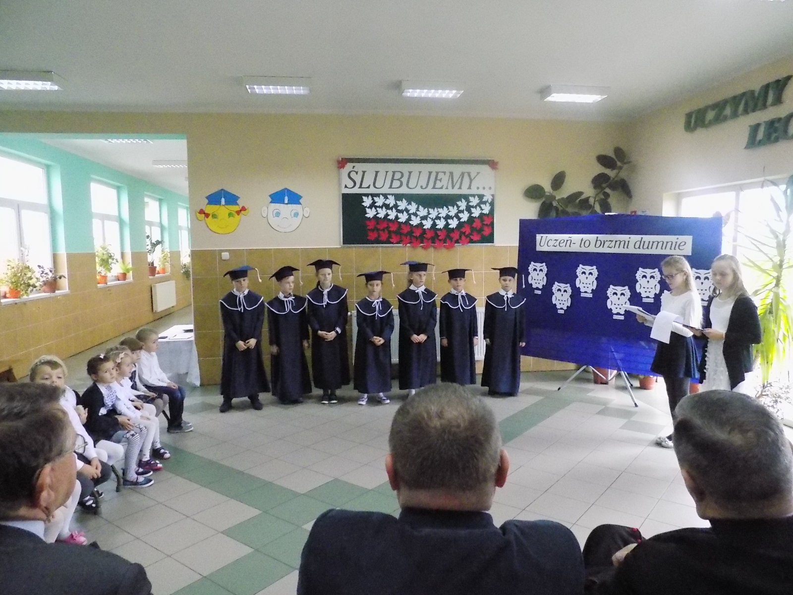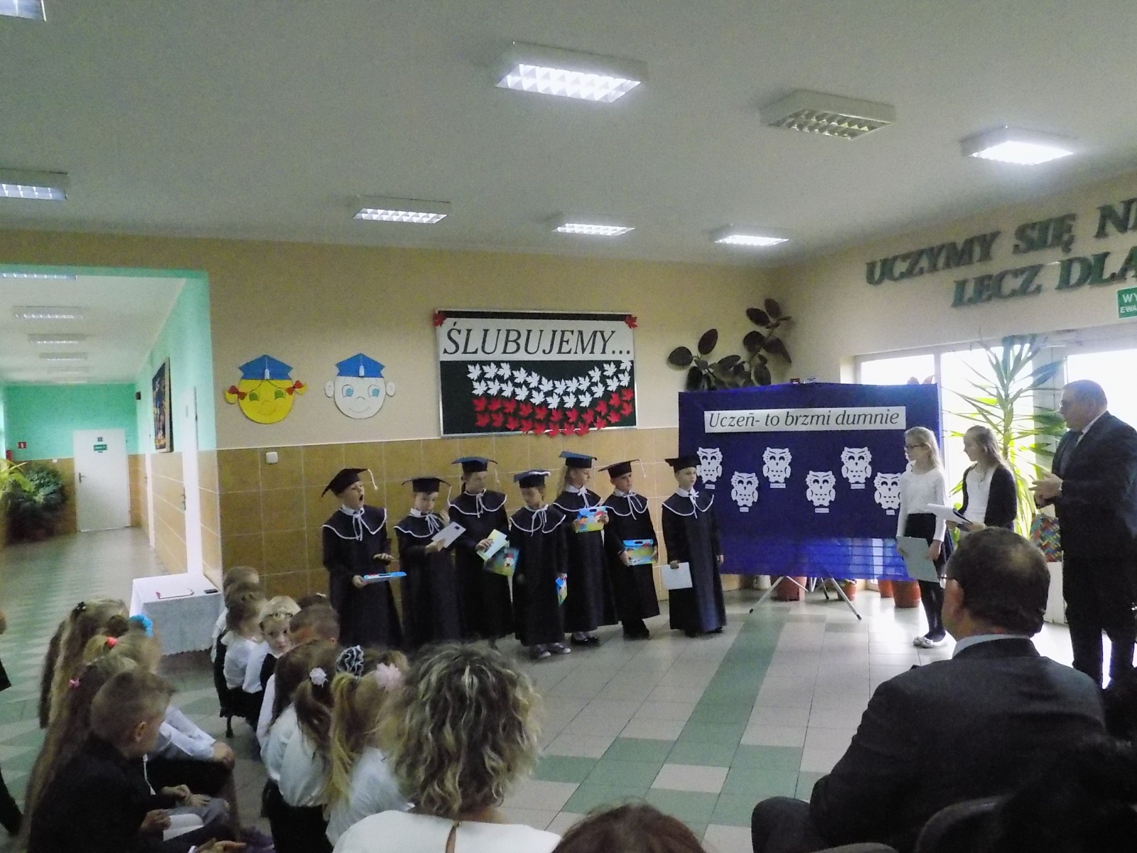 Doniosłym momentem uroczystości było ślubowanie pierwszoklasistów, które wzbudziło wiele emocji. Pani dyrektor kolorowym ołówkiem dokonała aktu pasowania. Nie obyło się również bez dyplomów i słodkich upominków od przybyłych gości: księdza prałata Stanisława Płaszczyka, wicewójta Gminy Malanów Piotra Cylsa i przewodniczącego Rady Gminy pana Andrzeja Tomsa.