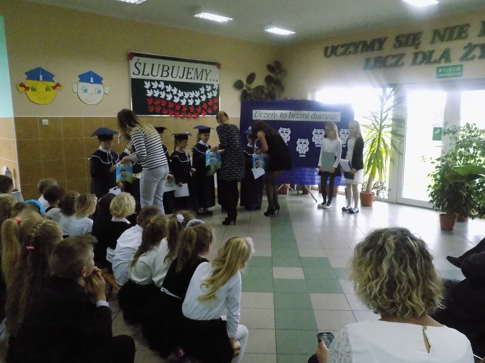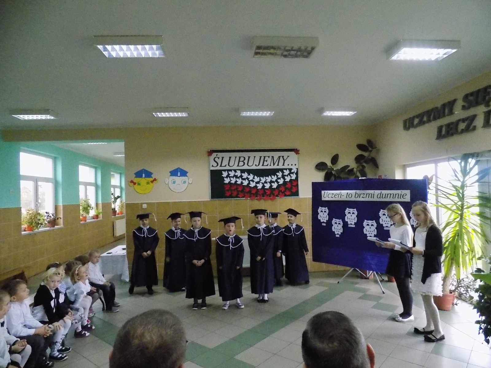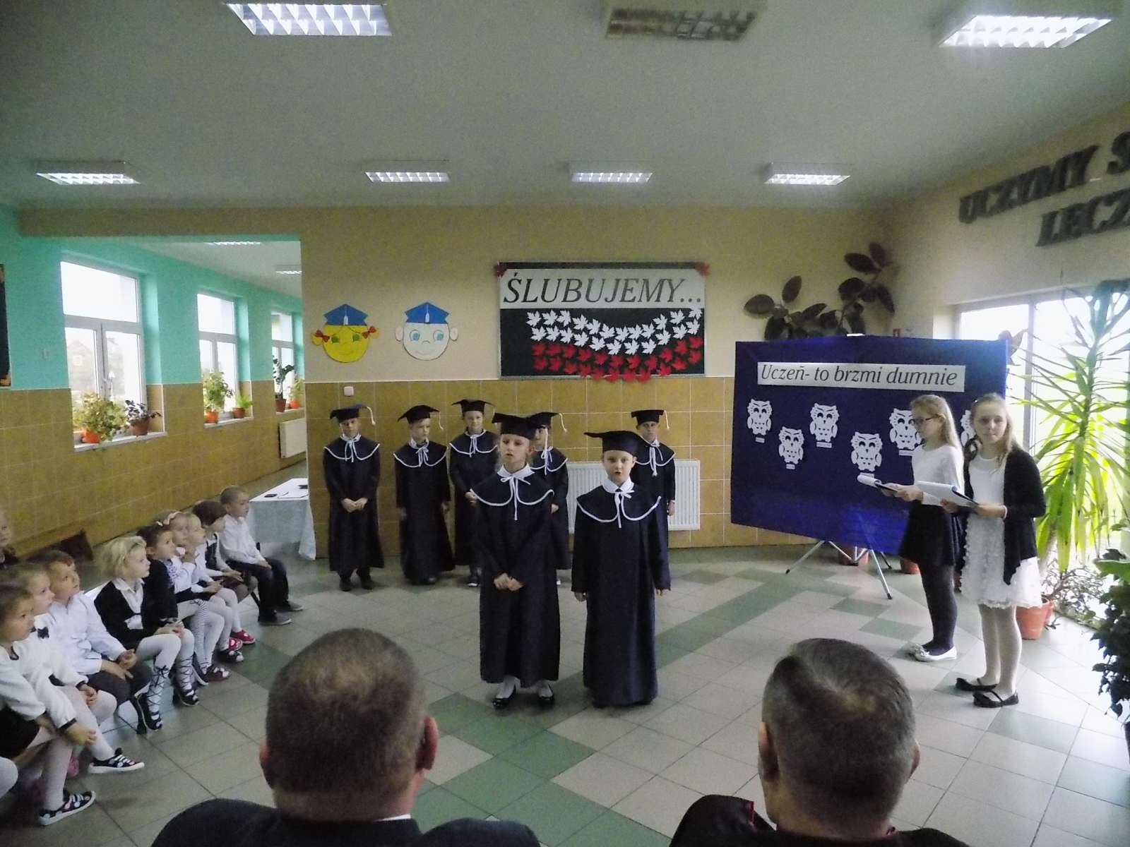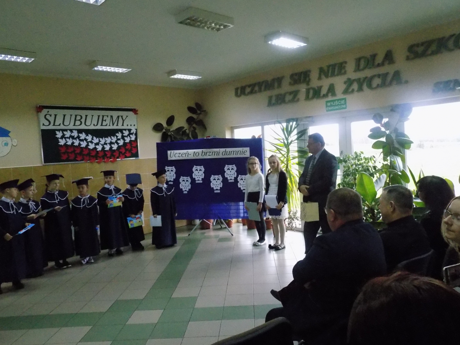 Doniosłym momentem uroczystości było ślubowanie pierwszoklasistów, które wzbudziło wiele emocji. Pani dyrektor kolorowym ołówkiem dokonała aktu pasowania. Nie obyło się również bez dyplomów i słodkich upominków od przybyłych gości: księdza prałata Stanisława Płaszczyka, wicewójta Gminy Malanów Piotra Cylsa i przewodniczącego Rady Gminy pana Andrzeja Tomsa.