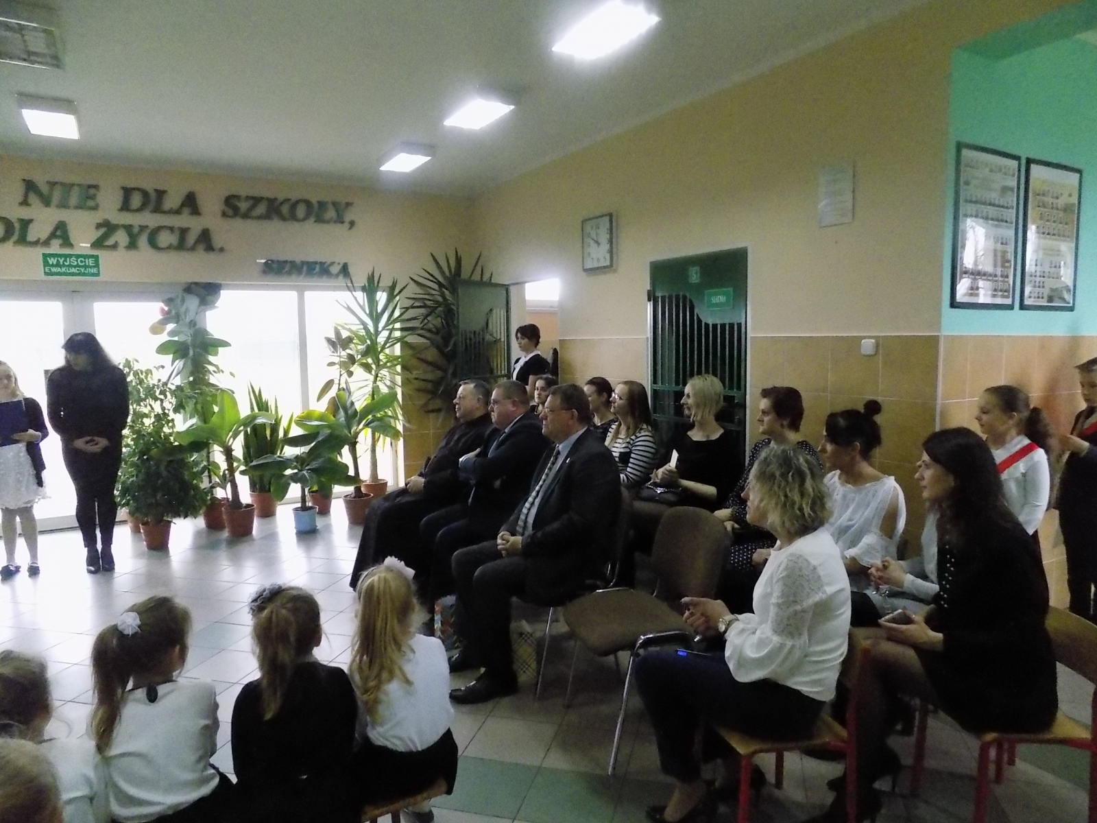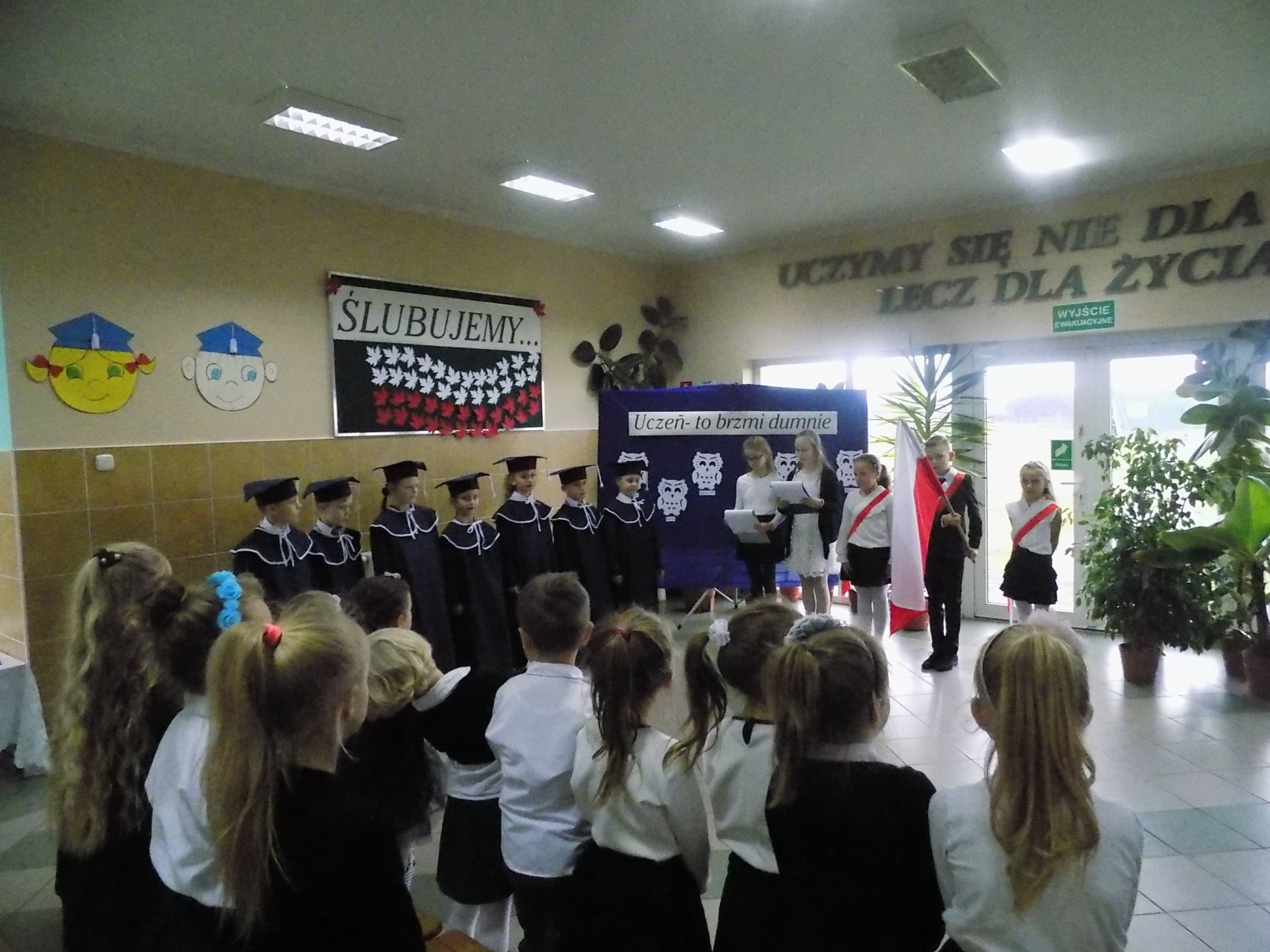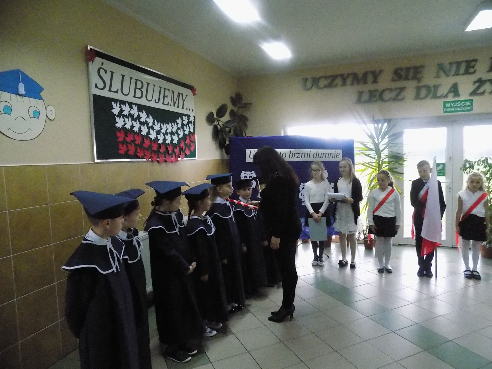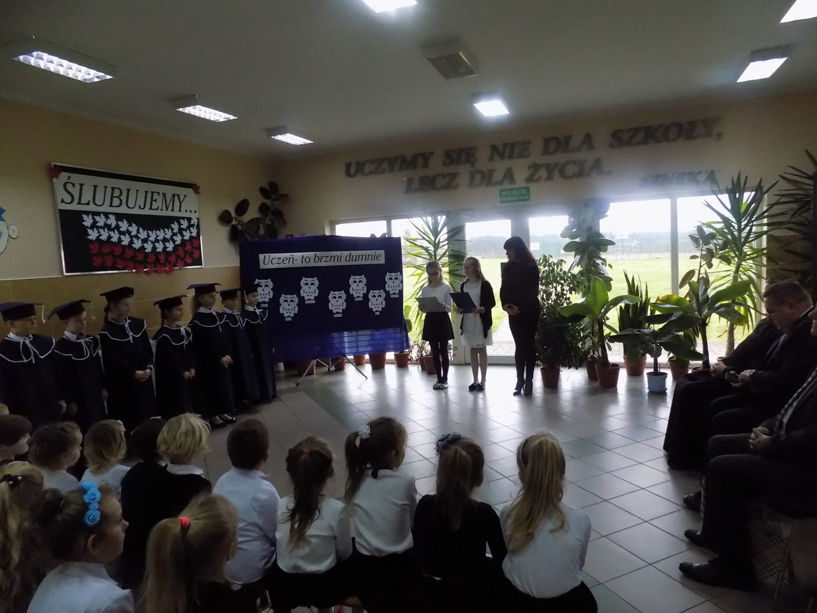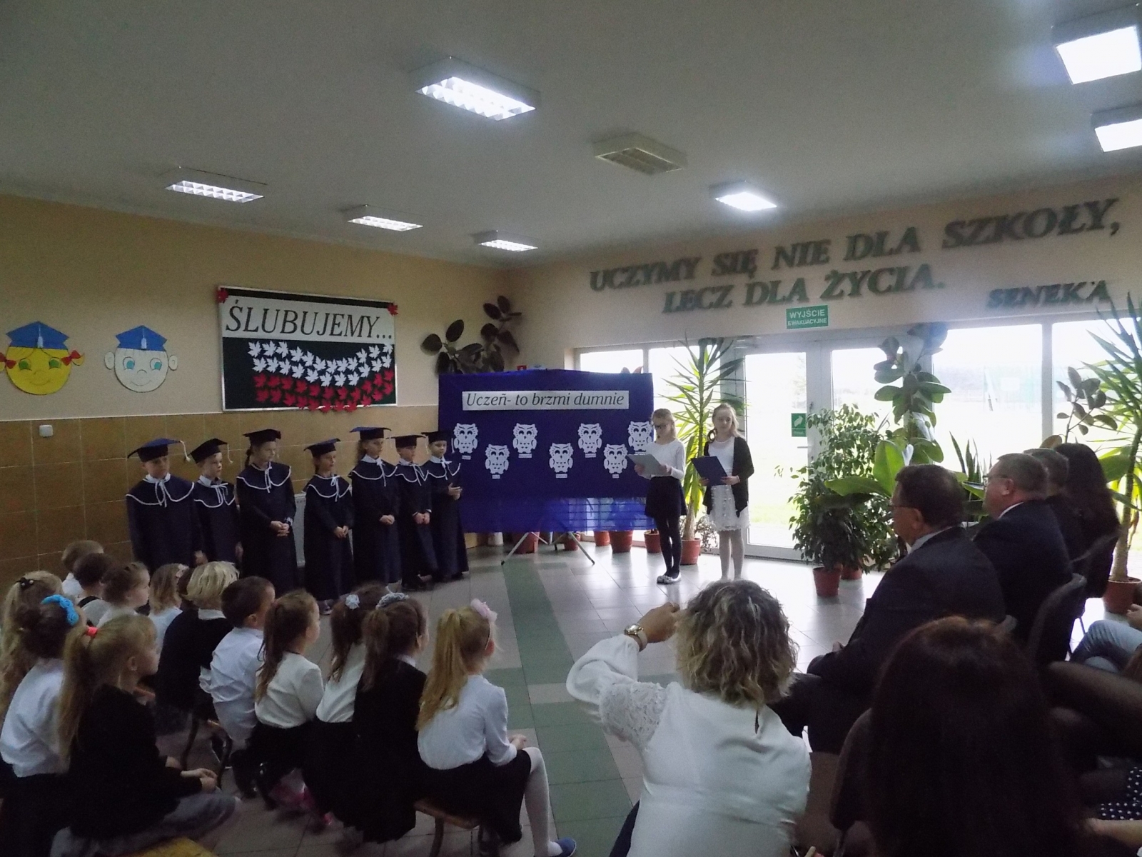 Doniosłym momentem uroczystości było ślubowanie pierwszoklasistów, które wzbudziło wiele emocji. Pani dyrektor kolorowym ołówkiem dokonała aktu pasowania. Nie obyło się również bez dyplomów i słodkich upominków od przybyłych gości: księdza prałata Stanisława Płaszczyka, wicewójta Gminy Malanów Piotra Cylsa i przewodniczącego Rady Gminy pana Andrzeja Tomsa.