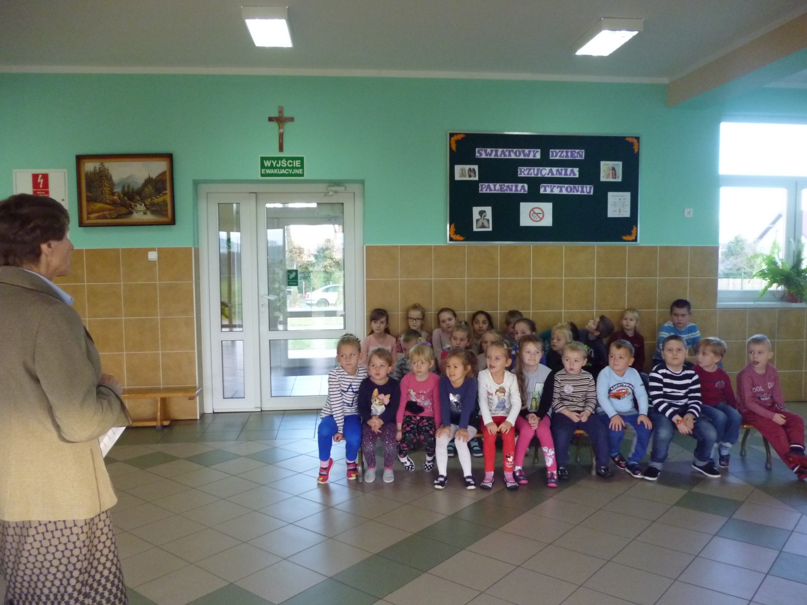 Z okazji Światowego Dnia Rzucania Palenia Tytoniu w naszej szkole odbył się poranek profilaktyczny. Z tej okazji pielęgniarka szkolna przeprowadziła z uczniami i przedszkolakami pogadankę na temat szkodliwości palenia i biernego palenia tytoniu.