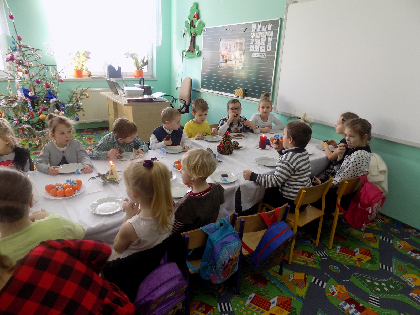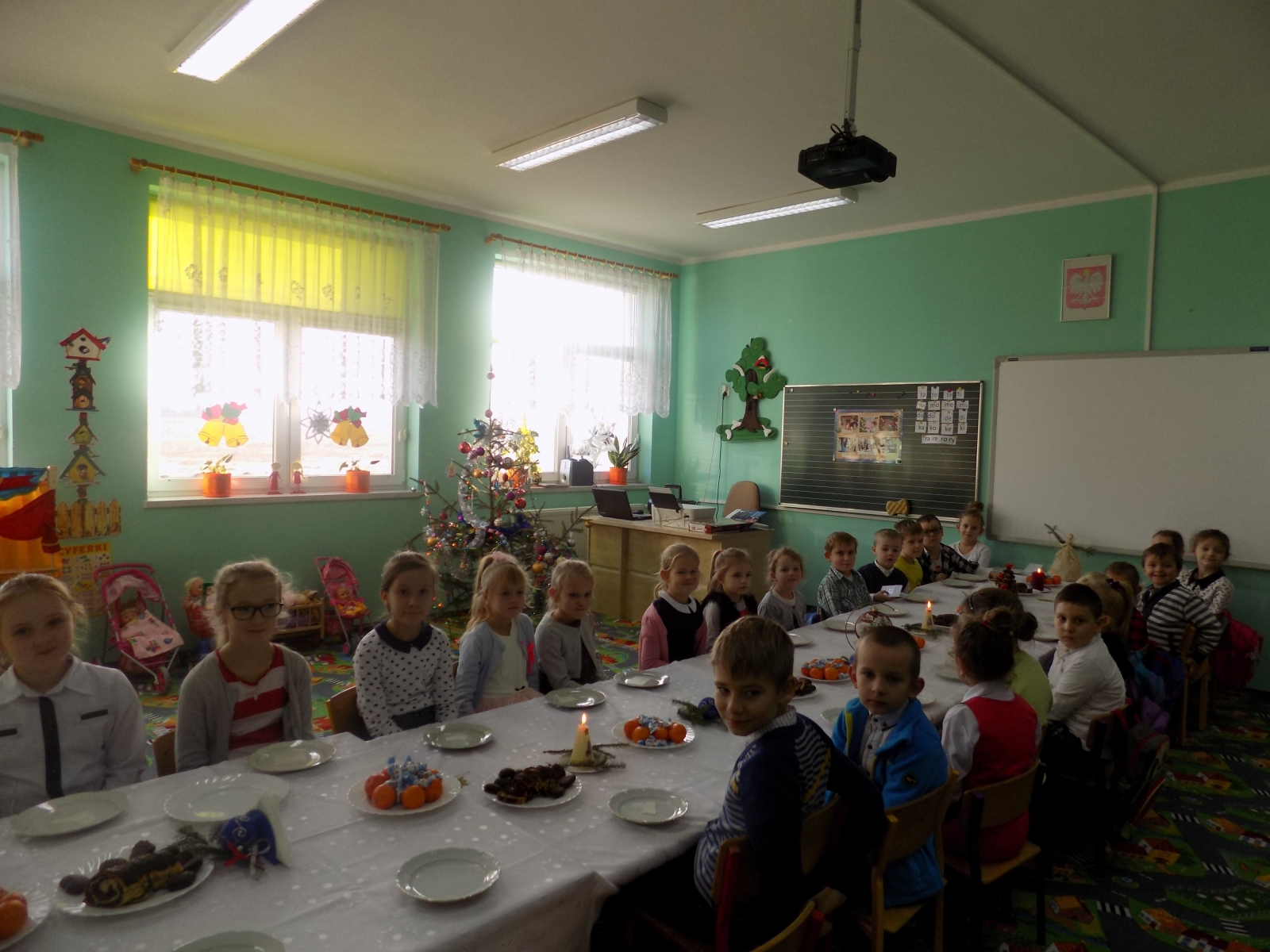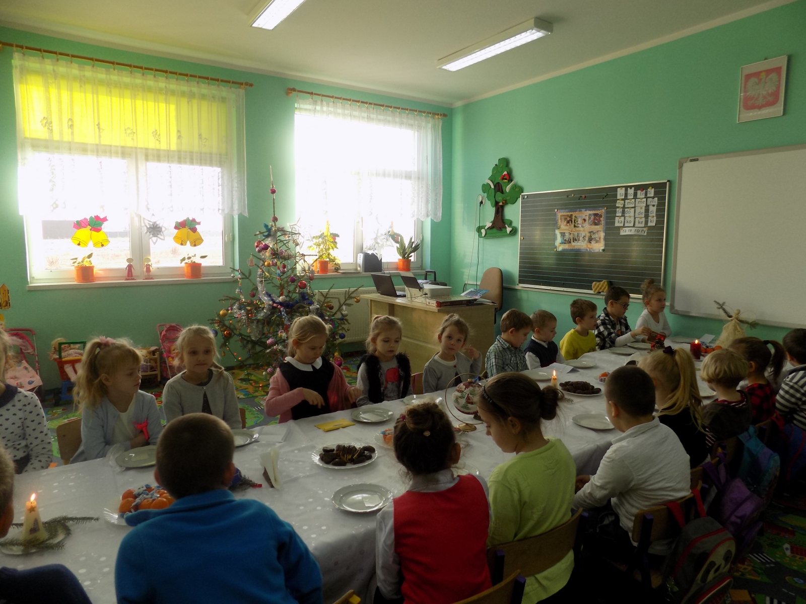 22 grudnia kolejny raz zorganizowaliśmy szkolną wigilię. W sali przedszkolaków starsi uczniowie wraz z wychowawczyniami przygotowali świąteczny stół. Ustawiono smakołyki i przygotowano dekoracje. Kiedy wszystko było gotowe, pani dyrektor - Iwona Krajewska złożyła pracownikom i dzieciom świąteczne życzenia. Potem łamano się opłatkiem i składano indywidualne życzenia. Następnie wszyscy zasiedli do stołu, aby częstować się świątecznymi smakołykami. Po poczęstunku wspólnie śpiewano kolędy.