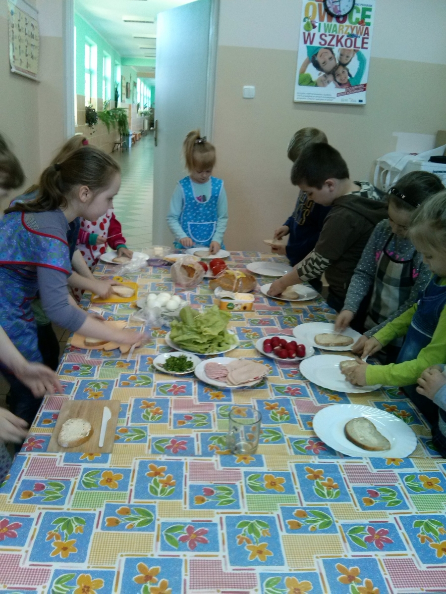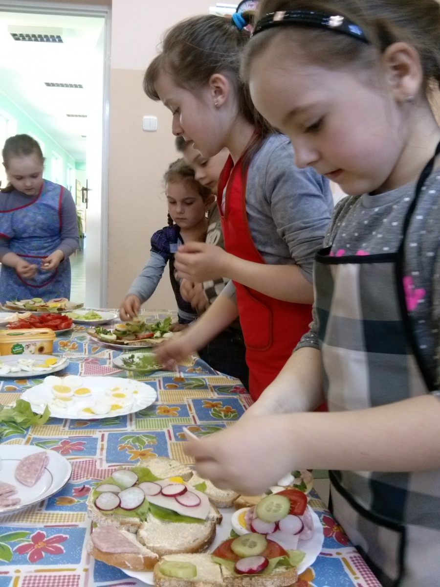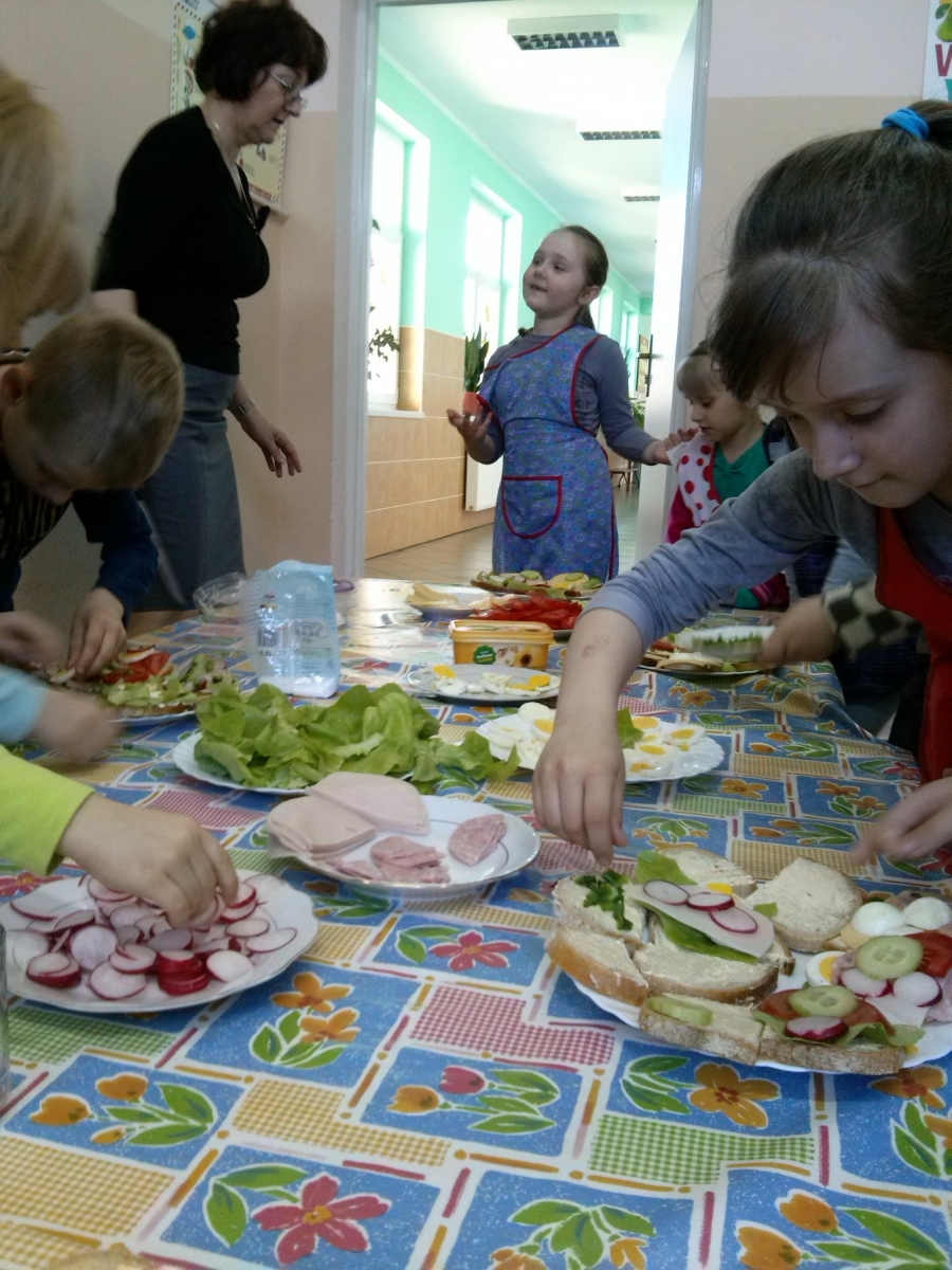 Dzieci z oddziału przedszkolnego i uczniowie klasy I we wtorek 21 kwietnia w ramach projektu "Moje dziecko idzie do szkoły" samodzielnie przygotowywały kanapki na śniadanie. Pamiętały o przestrzeganiu higieny i bezpieczeństwa podczas pracy. Dzieci dowiedziały się o konieczności spożywania warzyw w codziennej diecie. Kanapki były smaczne i kolorowe, dlatego szybko znikały z talerzy.